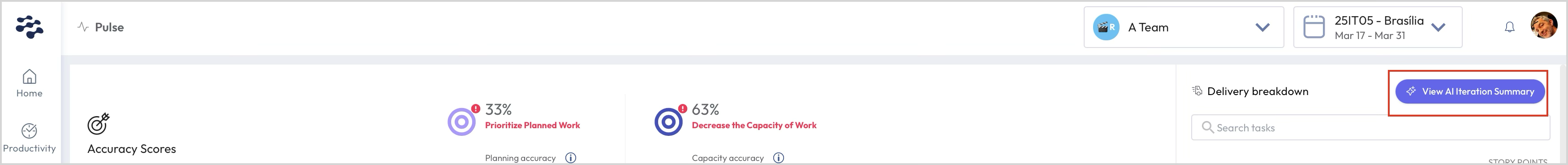 It also serves as your team’s real-time dashboard for tracking iteration progress. It helps you visualize how well your team is executing work during a sprint, identify bottlenecks, and surface key delivery insights. This view is especially valuable during daily standups, mid-sprint reviews, and retrospectives. It helps you visualize how well your team is executing work during a sprint, identify bottlenecks, and surface key delivery insights. This view is especially valuable during daily standups, mid-sprint reviews, and retrospectives.