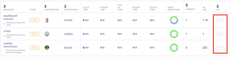 - While in draft status, commits are attributed to coding time but excluded from cycle time. For more information, refer to the section "Draft Pull Requests".