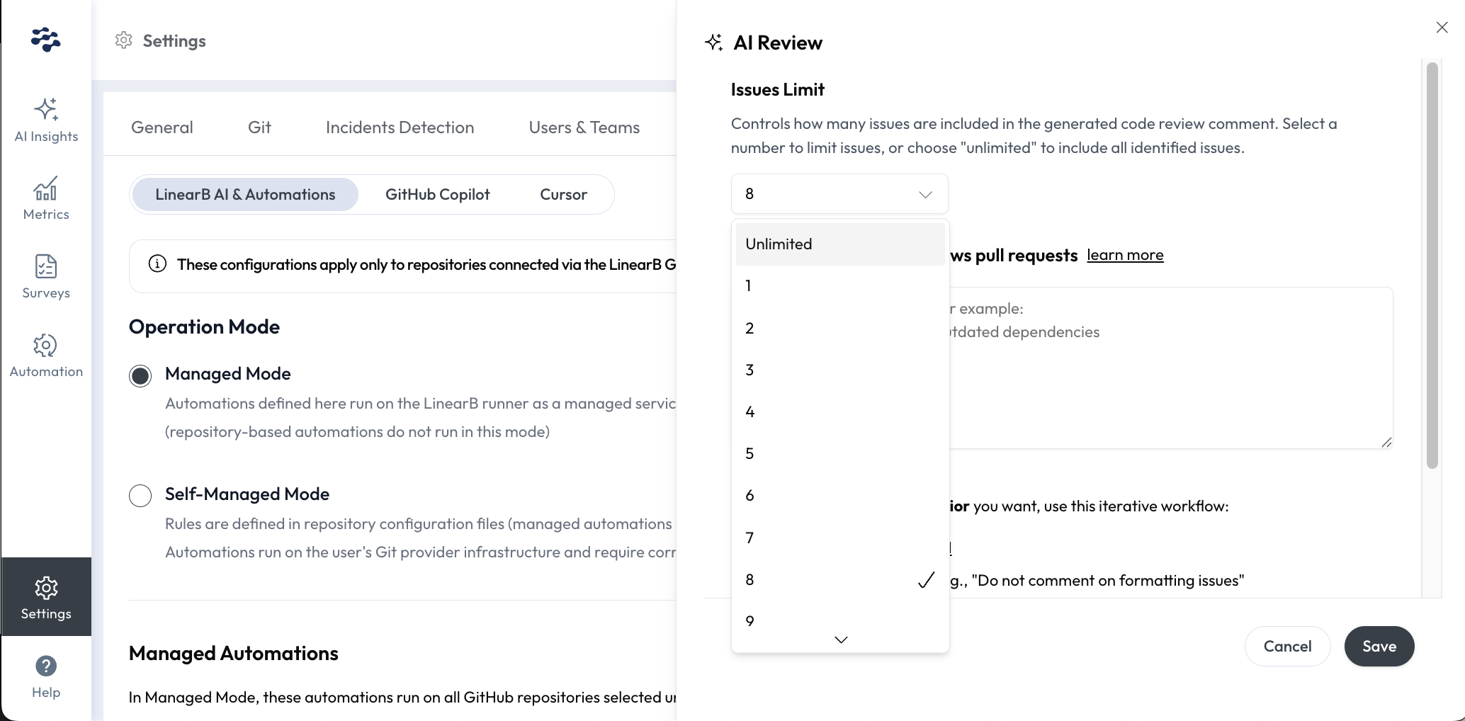User admins in Essentials using the managed mode can configure this directly in your Settings UI under AI Tools > Managed Automations > AI Review > Edit > Issues Limit.