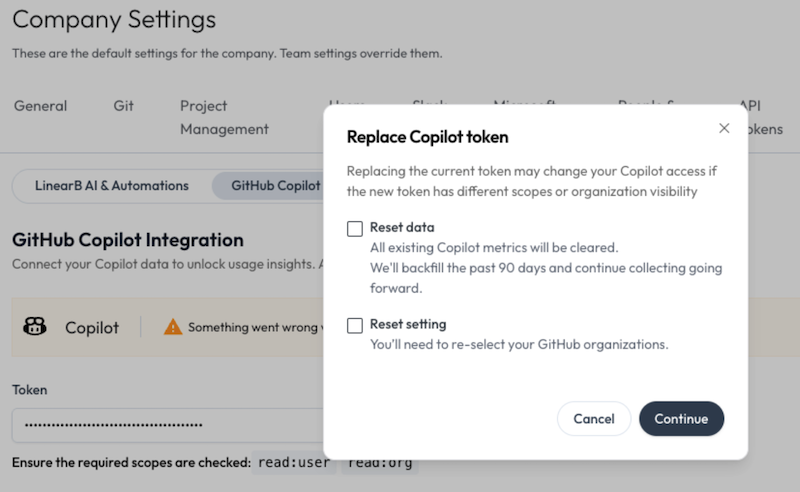 - Reset data — all existing Copilot metrics in LinearB are cleared. LinearB backfills the last 90 days and continues collecting going forward.