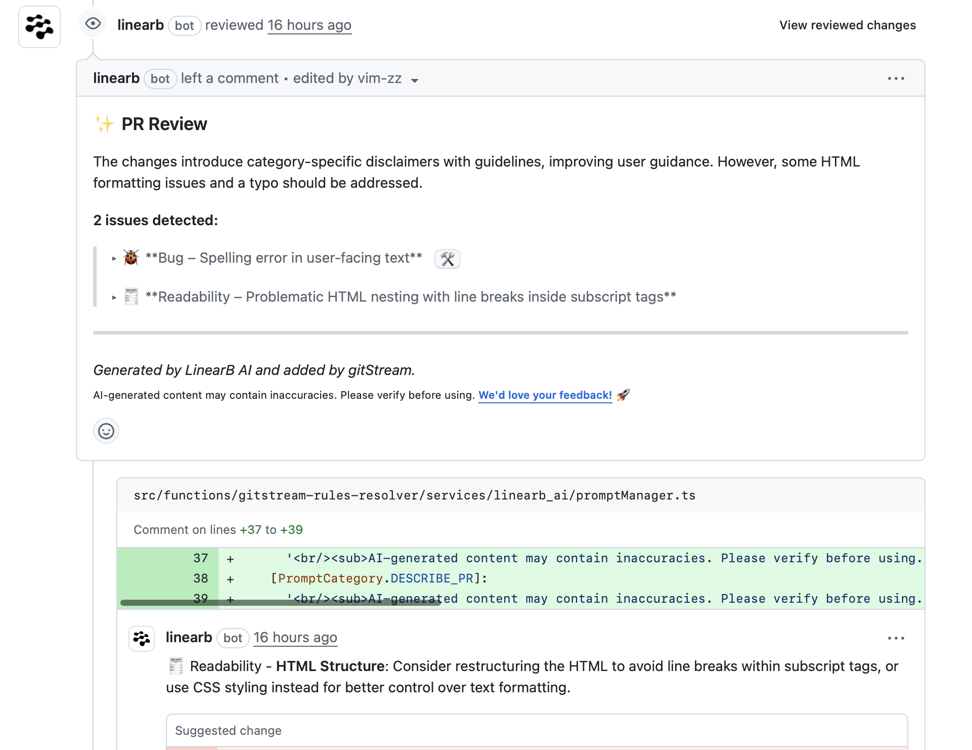 - A note in the comment body confirming a code suggestion is included