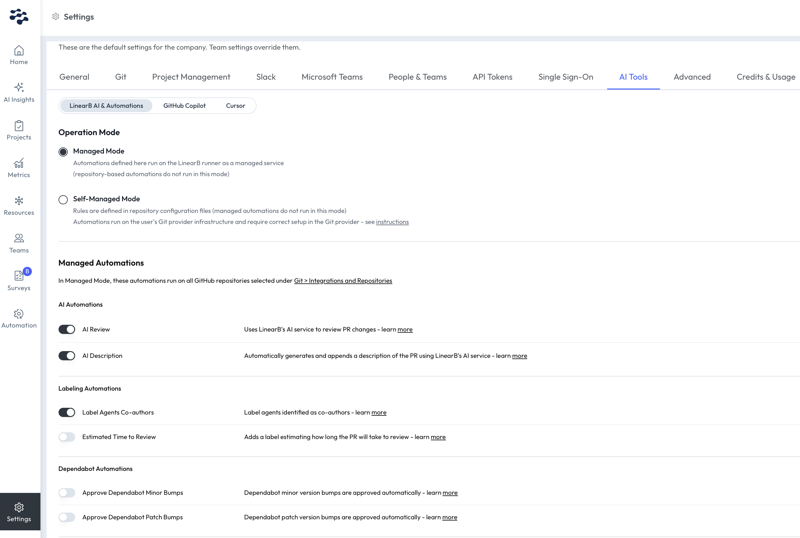 The LinearB AI & Automations tab lets admins enable and manage LinearB’s catalog of AI-powered automations. Use this tab to select an operation mode, turn automations on or off, and customize AI Review and AI Description to match your organization’s standards.