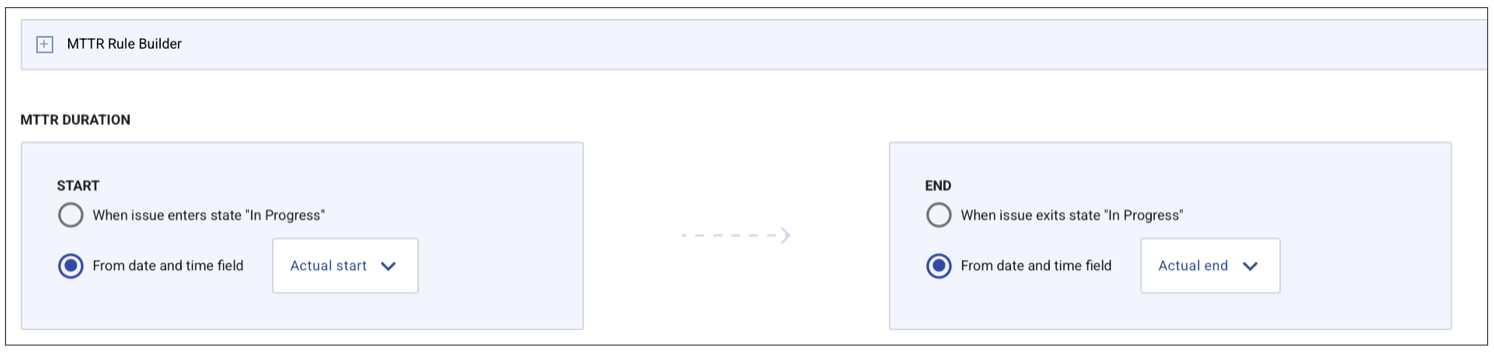 - Utilize any custom date field in your issues to track and measure the start and end times of critical issues. In the MTTR Duration section, specify the fields to be used for this purpose.