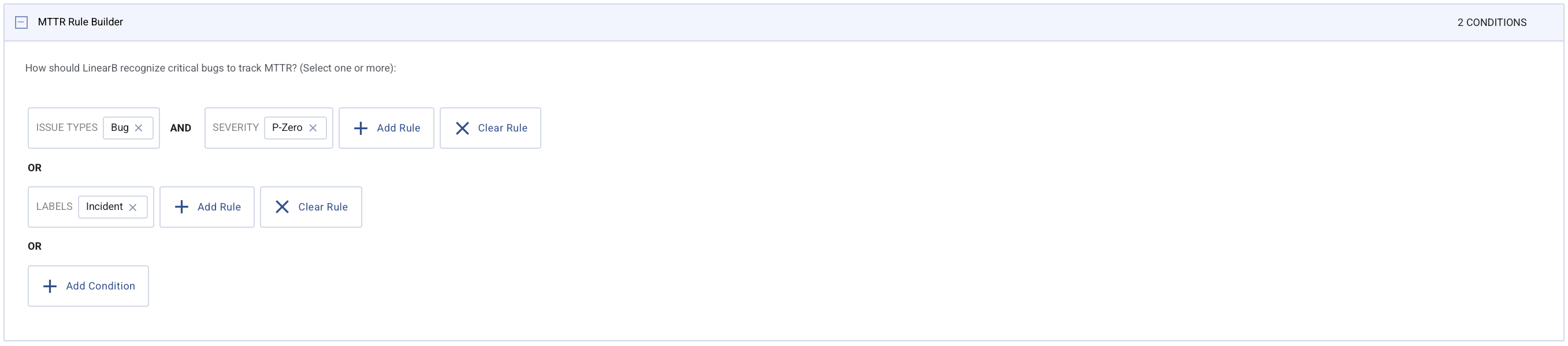- By default, LinearB includes all issues classified as Bugs in this metric. With a paid LinearB subscription, you can customize what qualifies as a production bug under Company Settings > Project Management > Incidents. You can refine the issues included in your MTTR calculation based on the following criteria: