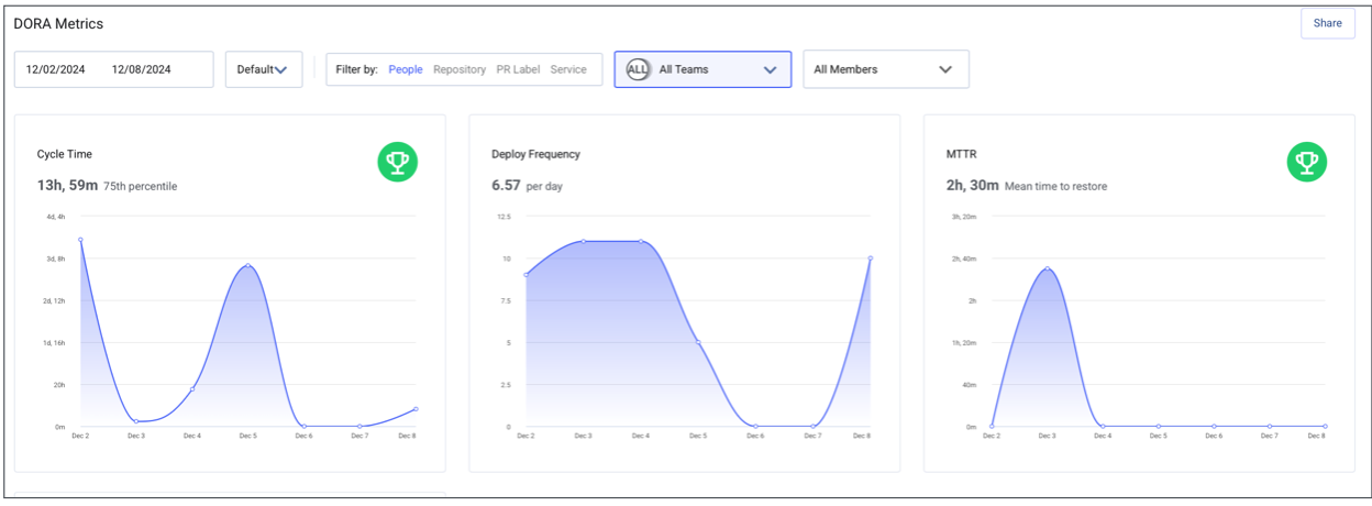 LinearB also provides the capability to calculate MTTR on a team basis. The calculation relies on the conditions defined in your organization settings (e.g., Issue Type, Label, Field) and applies additional filters based on the team board configuration in team settings.